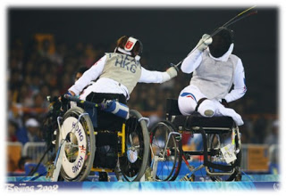 Duas pessoas com deficiência em cadeira de rodas praticam esgrima