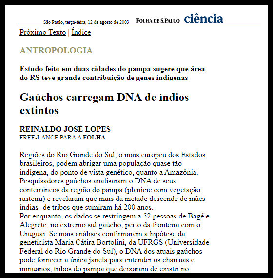 Nesse aspecto, pesquisa recente realizada no campo da continuidade genética foi desenvolvida na região do pampa e, constatada uma relação direta de ancestralidade, buscou-se reestabelecer o parentesco e o laço simbólico com charruas e minuanos (Bortolini, 2019). O que poderia ser mais sintomático do que uma pesquisa a nível de DNA, cromossômica, para certificar de que se trata de uma memória que se dissolveu e dissimulou quase completamente no séc. XX?